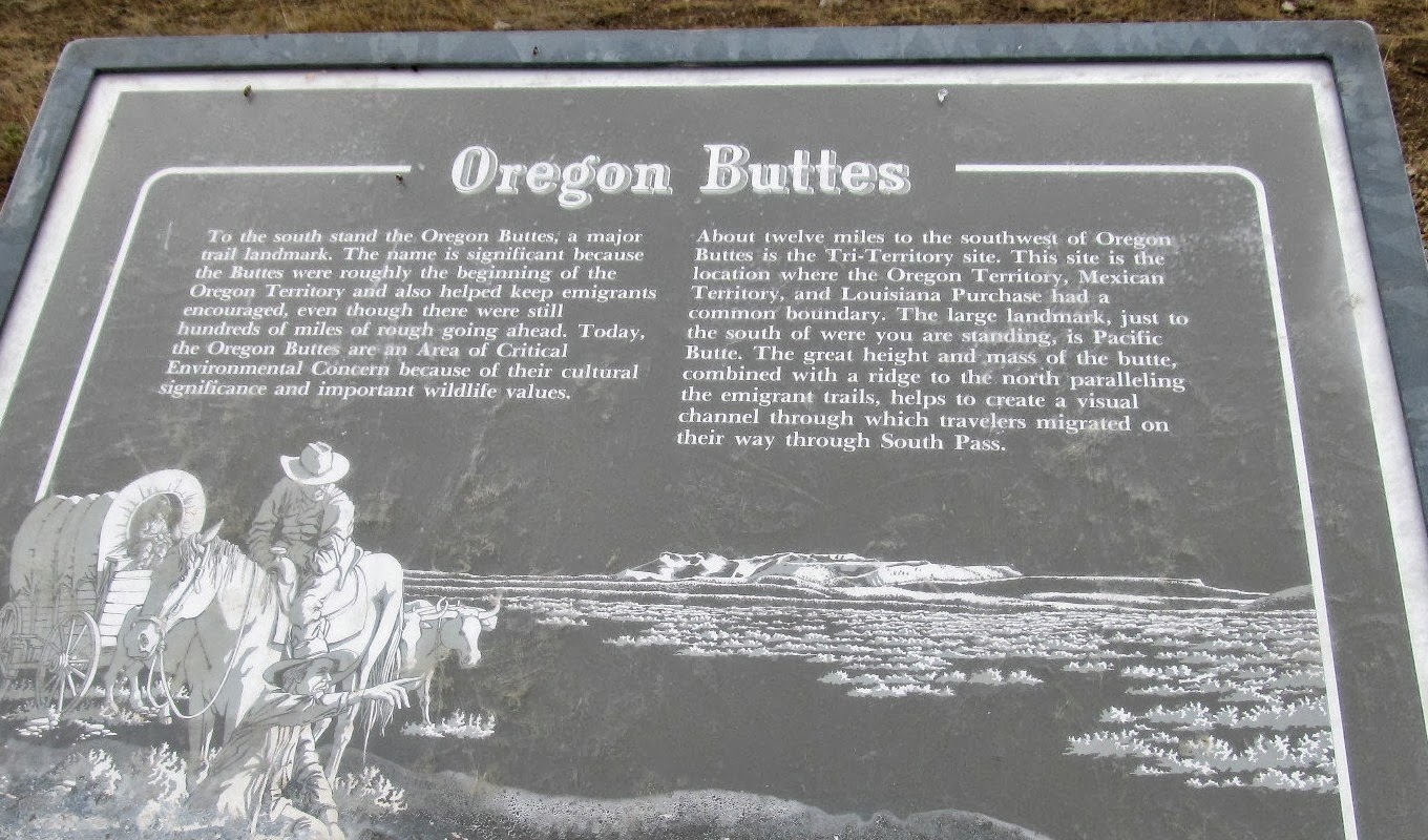 Another faded marker shows the Oregon Buttes. This landmark can be seen directly above the sign and is visible for many miles, a compass for weary travelers.
